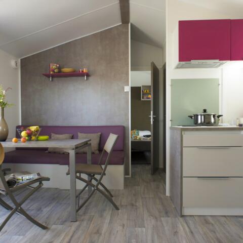 Keuken uitgerust met elektrische kookplaat, vaatwasser, koelkast met vriesvak, afzuigkap, magnetron, Nexpresso-koffiezetapparaat met capsules, citruspers, broodrooster, waterkoker, plancha, zeevruchtenbestek, serviesgoed en keukengerei.