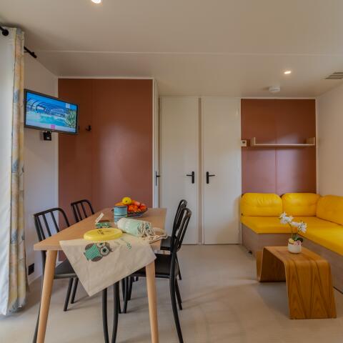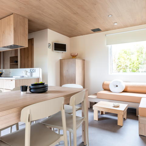 Een woonkamer met eethoek. Verwarming in alle kamers.