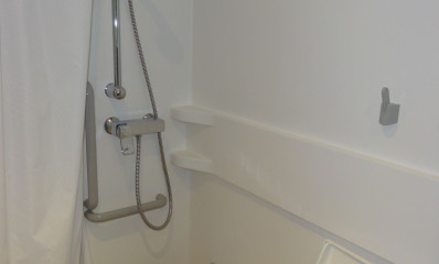 Binnen geniet u van een lichte en functionele leefruimte waar elegante en warme materialen een rustgevende sfeer creëren. De leefruimte bestaat uit een open keuken met een comfortabele zithoek, een praktische en volledig aangepaste doucheruimte, evenals een slaapkamer die ontworpen is om u een herstellende nachtrust te bieden na uw activiteiten. De indeling is zorgvuldig doordacht om verplaatsingen te vergemakkelijken en optimaal comfort te bieden aan personen met beperkte mobiliteit.