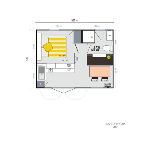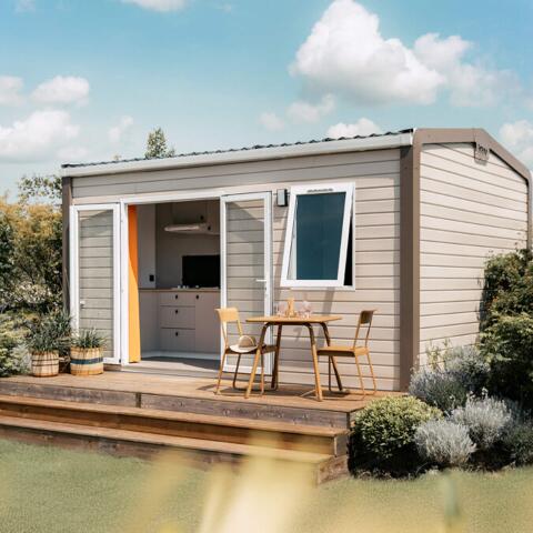 De Stacaravans Prestige combineren kleur en functionaliteit. Het intieme terras is de ideale plek voor een ontbijt met familie of vrienden. Binnen is er altijd genoeg licht dankzij de vele ramen. Als de avond valt, beginnen de vleermuizen met hun voorstelling, een spektakel waar je nooit genoeg van krijgt.
