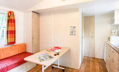 Een woonkamer met een eethoek. Elektrische verwarming alleen in de woonkamer. Wifi inbegrepen.
