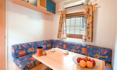 Baia Comfort: In this mobile home can sleep up to a maximum of 4 persons and consists of two bedrooms and 2 bathrooms: one double bed room with a small bathroom (sink and toilet), one bedroom with 2 single beds (they are not joinable and they are not suitable for people of average height), second bathroom with toilet, shower and sink, dining room with table and sofa, kitchenette with sink and fridge. Wood terrace with table and chairs outside.