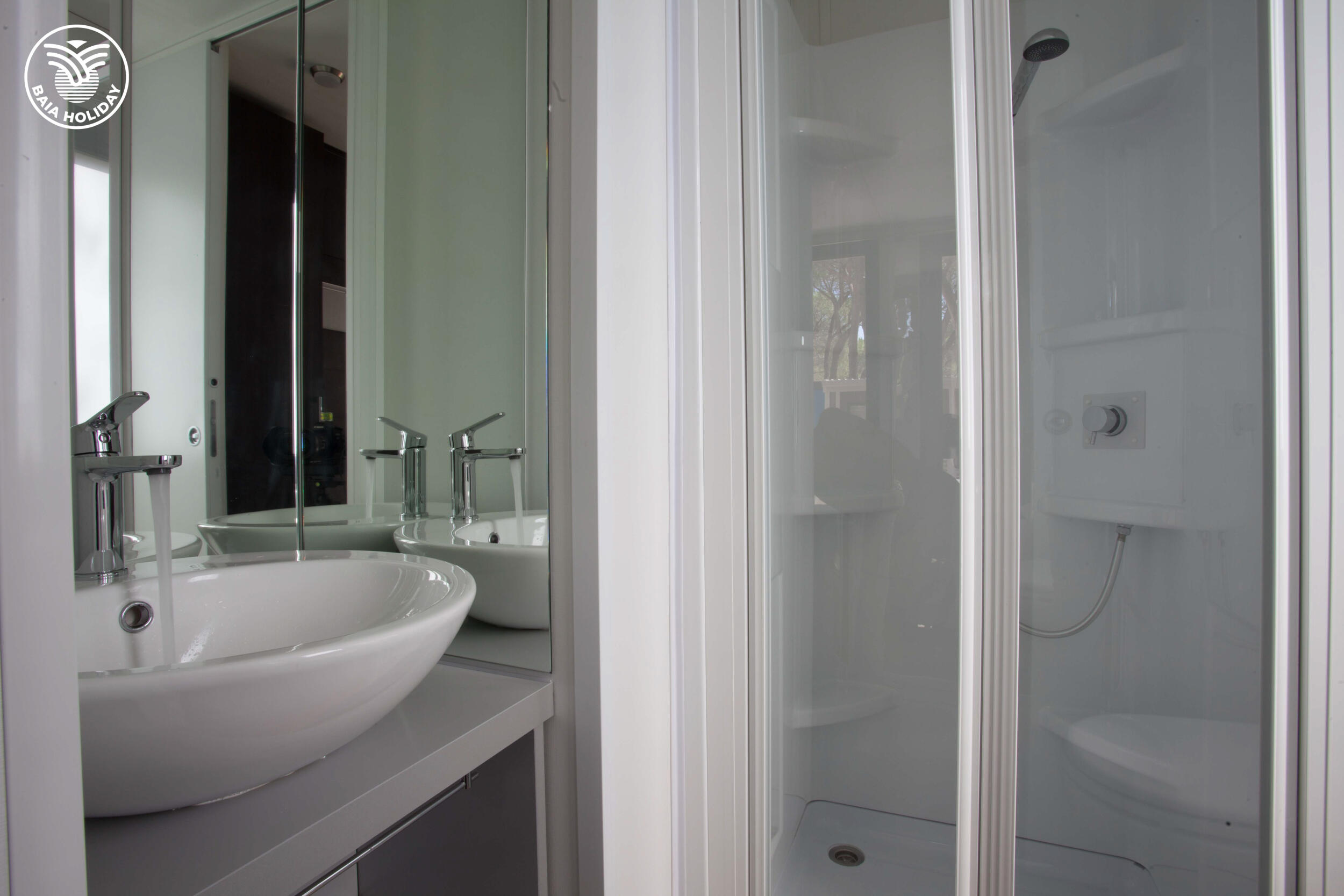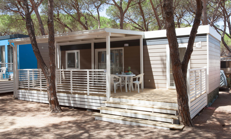 The Mobile Home Baia Elite with an area of about 33 sq.m. is designed to host families of up to 6 people. The interior furnishings are modern and comfortable: a corner kitchen with a peninsula (peninsula present only in some accomodation) , complete with a 4-burner gas cooker, sink, pots and pans, column fridge with freezer. The large French window, which overlooks the spacious wooden veranda gives brightness to the large living room, furnished with a modern sofa, table and chairs. To complete the accommodation, a sleeping area with 3 bedrooms, one with a double bed and 2 with 2 single beds, a complete bathroom with toilet, shower, sink and , in some units, a second bathroom with WC and washbasin.