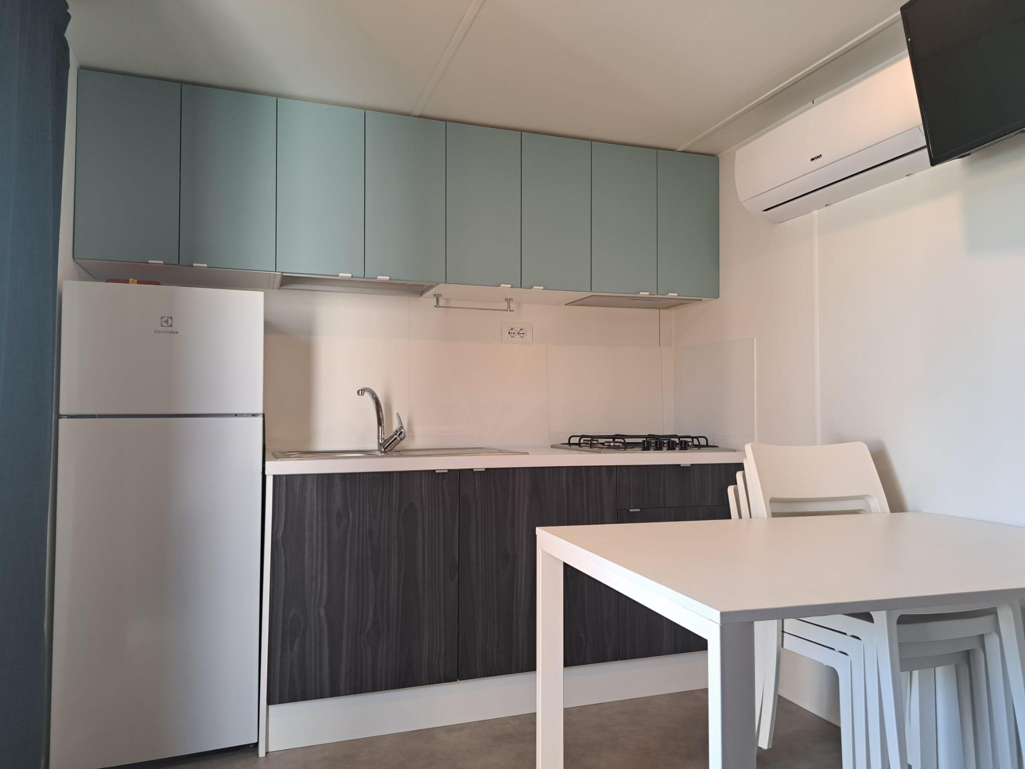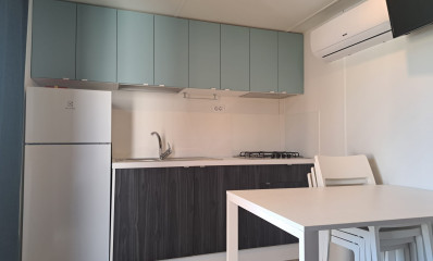 It has an area of 25mq and can hold up to 4 adults and one child. It is composed of a living room with table and chairs, a kitchenette equipped with a column fridge with a freezer, a 4-burner gas cooker, a sink, pots and pans and dishes. The sleeping area consists of 2 bedrooms, one with a double bed and one with 2 single beds. The accommodation has 1 complete bathroom with toilet, shower and sink .A covered wooden veranda equipped with table and chairs allows you to enjoy the outdoor spaces, typical of a holiday in nature.