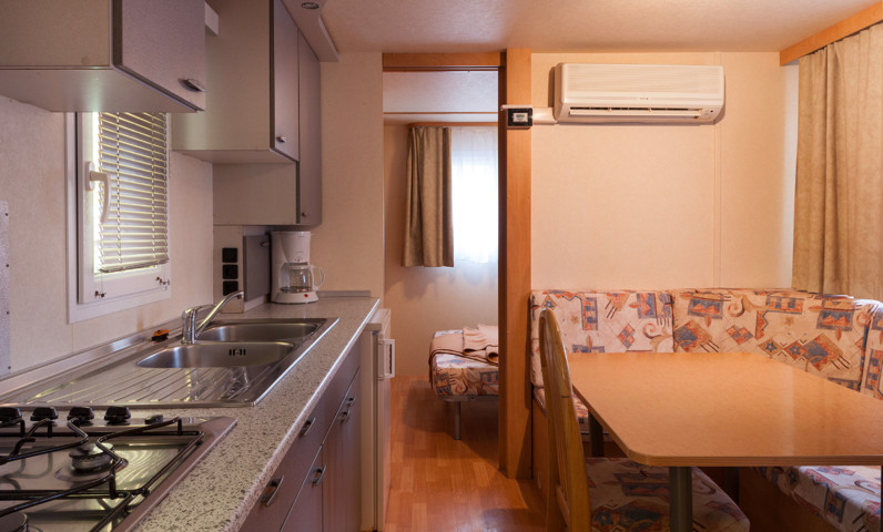 Het heeft een oppervlakte van ongeveer 24 m2 en biedt plaats aan maximaal 4 volwassenen en 1 kind. Het bestaat uit een woonkamer met tafel, stoelen, slaapbank, keukenhoek voorzien van koelkast met ijs, kookplaat 4 branders, spoelbak, kookgerei en servies. Het slaapgedeelte bestaat uit 2 slaapkamers, één met een tweepersoonsbed en één met 2 eenpersoonsbedden. De accommodatie is uitgerust met 1 complete badkamer met douche, wastafel en toilet. Buiten is een overdekte veranda die zich over de gehele lengte van de stacaravan uitstrekt de ideale plek om te genieten van een vakantie in de buitenlucht.