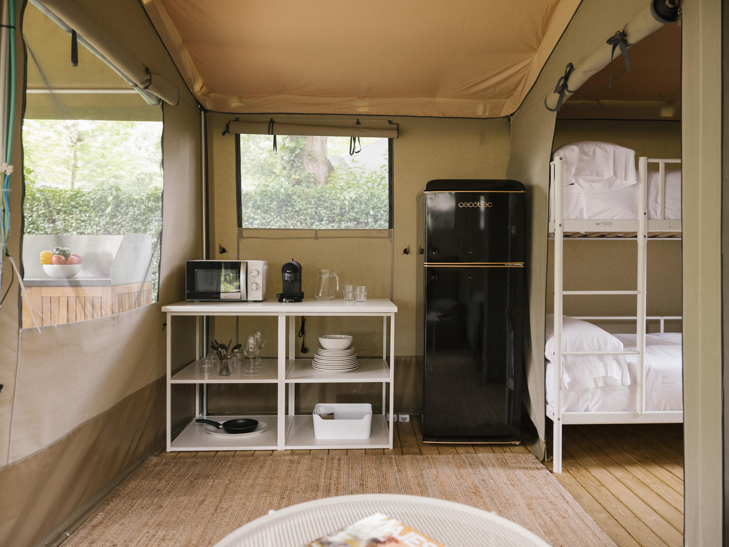 Onze Cottage Family heeft geen eigen badkamer. Voor de authentieke kampeerervaring voor gezinnen of grote groepen. Voor degenen die het meenemen van hun eigen tent missen hebben we deze accommodatie waarmee je kunt genieten van de authentieke kampeerervaring met een keuken. Het is geschikt voor maximaal 4 personen en heeft een tweepersoonsbed en 2 eenpersoonsbedden in stapelbedformaat. Het heeft een keuken met al het nodige keukengerei voor je verblijf.