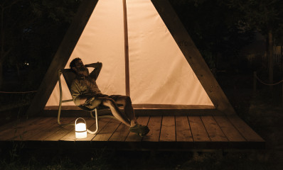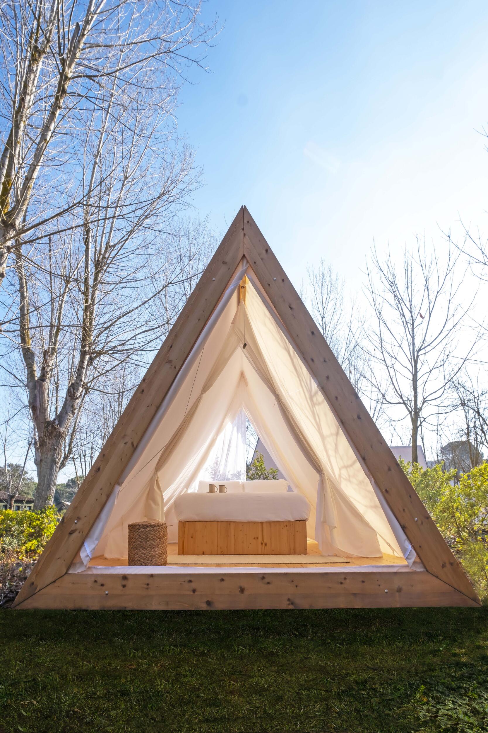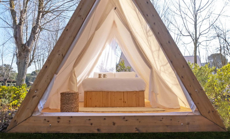 Charming and bright glamping popup tent surrounded by nature perfect for a romantic getaway. Our wooden tent offers all the comforts you are looking for during your stay: double bed on a wooden platform, parquet flooring, sockets to charge your devices, lighting and a mosquito net with 2 sides opening. Perfect for 2 people, it also has a terrace with 2 loungers.