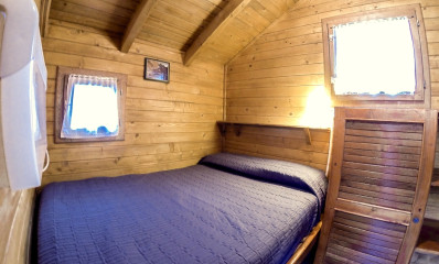 Elke hut bevat een kamer met een 1,35 meter breed tweepersoonsbed, een kast en een 190 x 70 cm slaapbank, samen met een overdekt terras dat een keuken en koelkast herbergt. Het wordt aangeraden om beddengoed en keukengerei mee te nemen. Strategisch gelegen in een rustige omgeving met indrukwekkend uitzicht en omgeven door bomen, bevinden de hutten zich dicht bij het servicegebouw, dat aparte cabines met douche, wastafel en toilet biedt voor extra comfort.